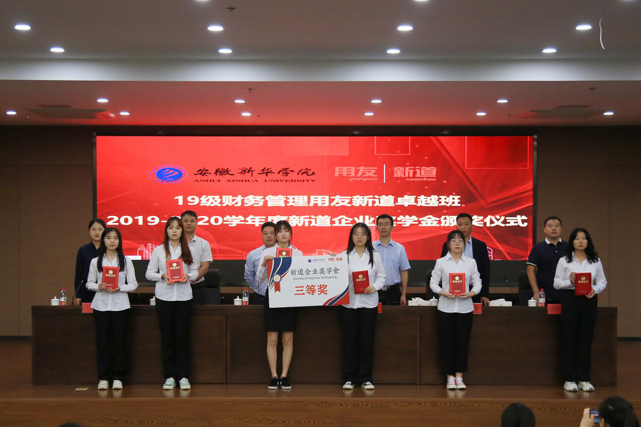 随后,校企双方领导为2019级36名“用友新道”奖学金获得者颁奖,并为2020级新生代表授予“云财务管理会计师”专属徽章,鼓励全体同学在新学期取得更大进步。2019级学生代表黄开云、2020级学生代表袁灿分别进行了发言。