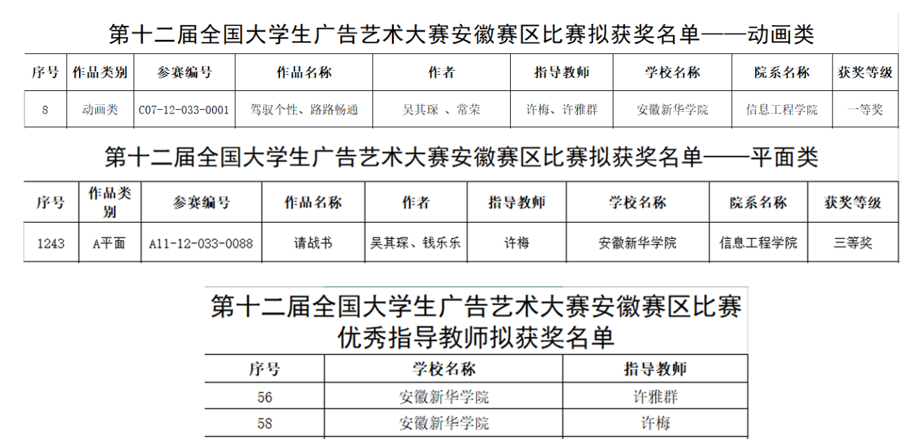 本网讯(通讯员:许梅)近日,2020年第12届全国大学生广告艺术大赛(以下简称:大广赛)全国总评审最终获奖名单发布。pp电子官方网站信息工程学院2018级数字媒体技术专业吴其琛和常荣同学的动画作品《驾驭个性、路路畅通》(指导教师:许梅、许雅群)获国赛二等奖、安徽赛区一等奖;吴其琛和钱乐乐同学的平面作品《请战书》(指导教师:许梅)获安徽赛区三等奖。