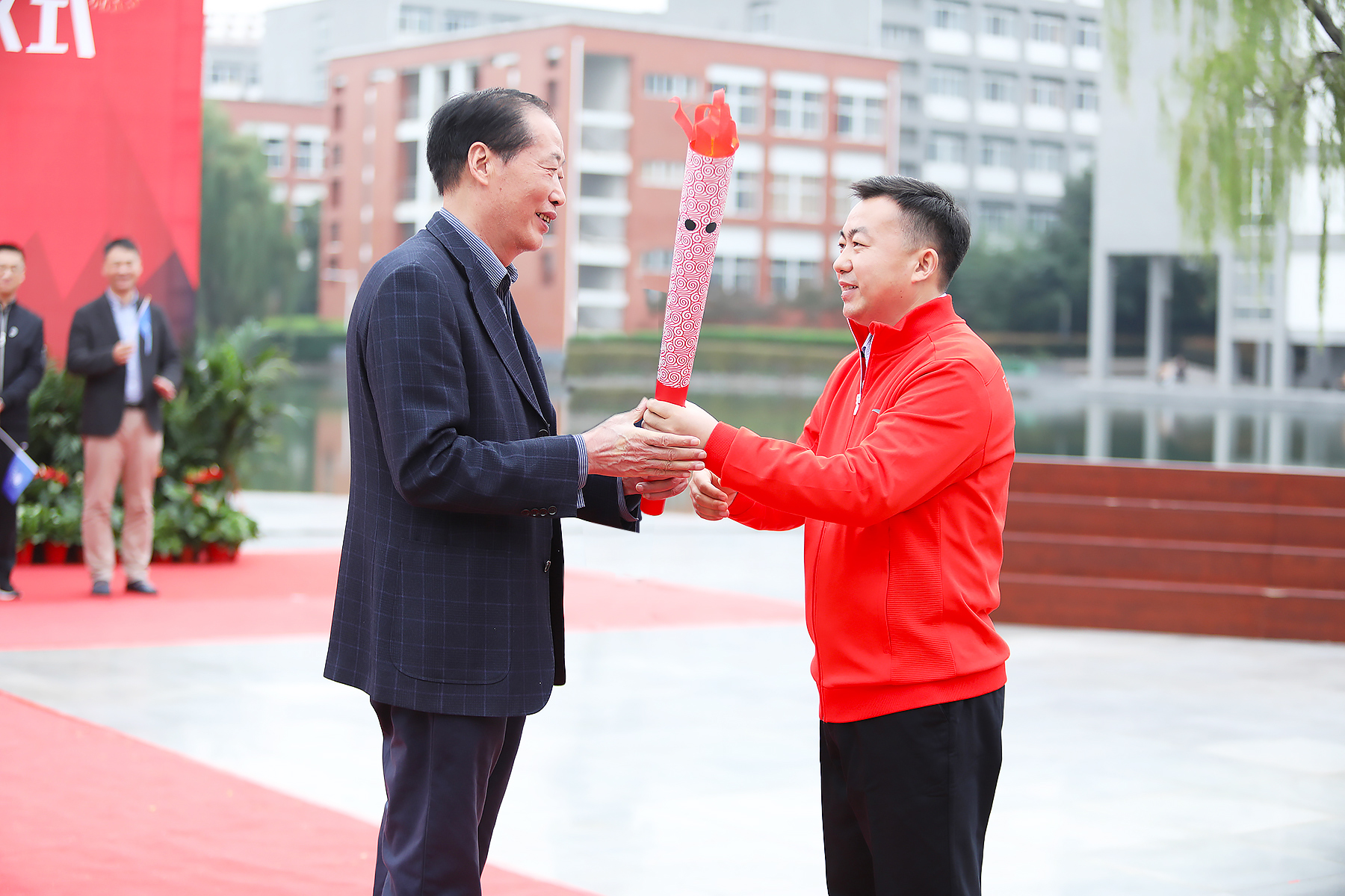 接着,火炬传递正式开始。此次火炬接力共设有20棒,由在校师生和优秀校友代表组成。储国定将火炬交由接力第一棒——新华工作20年的江建龙教授,30名由在校生组成的护跑队伍紧随在其身后,各学院学生在道路两侧,共同见证这一重要的历史时刻。国际教育学院2010届毕业生刘超作为第8棒火炬手参与火炬传递,他难掩激动地说到,“毕业十年后,以火炬手的身份参加母校二十年校庆,此时此刻我倍感光荣,祝福母校越办越好,桃李满天下!”火炬最终传递到文化与新闻传播学院2020级新生彭宜宏同学手中,她代表华园的新生力量接过希望的火炬,用青春诠释梦想。
