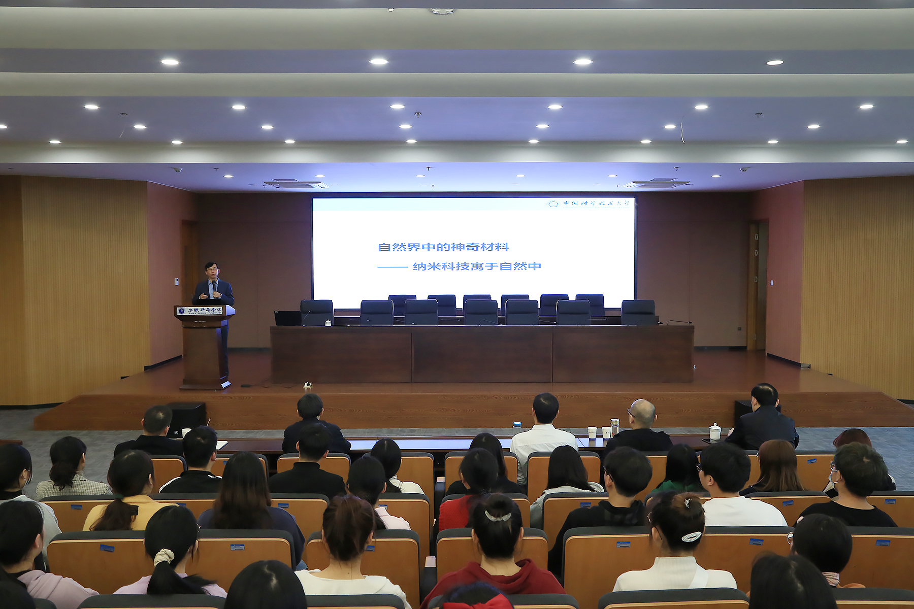 俞书宏院士还深入浅出地介绍了聚合物和有机小分子模板对纳米结构单元的尺寸、形状、晶相的调控规律,阐述了建立人工仿生合成珍珠母、仿生聚合物木材、超弹性抗疲劳材料等多级结构材料的合成方法,提出了软-硬模板效应协同控制生长的机制,通俗易懂地总结了纳米材料科技前沿的理论工作及实际应用,给听众展示了宏量制备高质量纳米材料及器件的广阔前景。