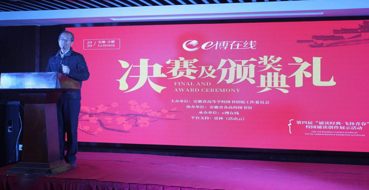 本网讯(通讯员:严素霞)12月8日,由安徽省高等学校图书情报工作委员会主办、e博在线承办的“e博在线杯”第四届诵读经典飞扬青春校园诵读创作展示活动决赛及颁奖典礼在合肥银泰酒店举办。