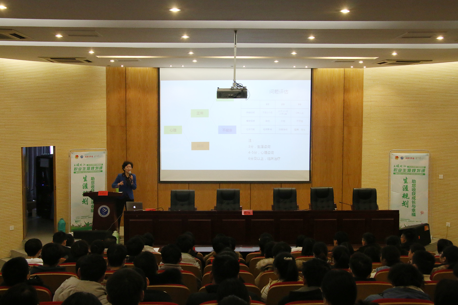 在座谈会和招聘会开展的同时,由国家认证生涯规划师、二级心理咨询师张进带来的《生涯规划-助力你在大学收获成长与幸福》讲座在校学术报告厅举行。张老师围绕职业定位和目标设定两个主要方面,通过案例分析、经验分享和互动交流等多种形式,指出了在大学低年级进行职业规划的重要性和长远意义,让同学们准确认知自我、明确职业倾向、提升综合素质能力,指导学生向内看了解自我,向外看了解外在环境,尤其她从企业HR角度提出了大学生在校阶段要努力培养好自己的专业素质和综合素质,才能在大学毕业时从容应对就业发展。最后与现场部分同学进行了交流,解答了同学的疑惑,全场160多名大一大二的同学共同报以热烈的掌声表示感谢。