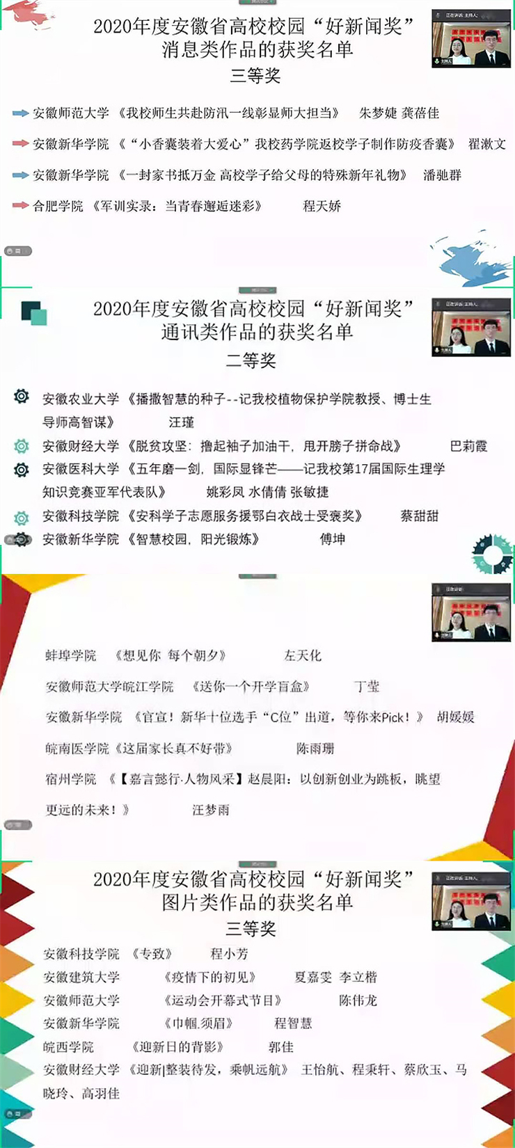 据了解,本届大学生记者峰会由安徽省青年新闻工作者协会和合肥学院共同举办,安徽青年报社和合肥学院党委宣传部承办。峰会立足校园,旨在传承青年人的时代精神,鼓励校媒人讲好校园故事,传播校园声音,用正确的舆论导向报道校内外活动的热点话题。在高校校园“好新闻奖”评选中,pp电子翟漱文老师的作品《“小香囊装着大爱心”——pp电子药学院返校学子制作防疫香囊》和潘驰群老师的作品《一封家书抵万金——高校学子给父母的特殊新年礼物》荣获2020年度安徽省高校校园“好新闻奖”消息类作品三等奖;程智慧同学的作品《巾帼,须眉》荣获“好新闻奖”图片类作品三等奖;傅坤同学的作品《智慧校园,阳光锻炼》荣获“好新闻奖”通讯类作品二等奖。胡媛媛同学的作品《官宣!新华十位选手“C位”出道,等你来pick》荣获“好新闻奖”新媒体类作品三等奖;董敏同学的作品《舒展青春该有的模样》 荣获“后浪奔涌,薪火承志”系列征文三等奖。