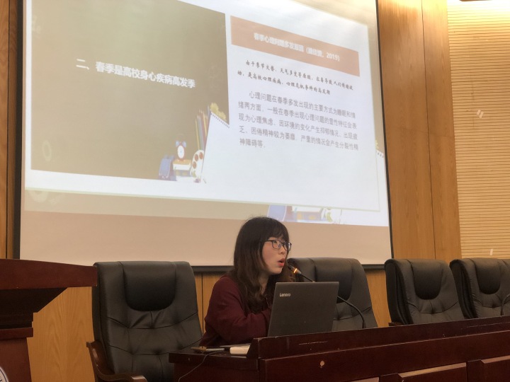 凌晨以“春风抚心——春季大学生心理健康教育工作提示”为主题,从了解“特别时期”、识别“特定对象”、评估“特殊风险”、提供“特色关爱”四个方面重点陈述新学期全校心理健康教育与安全(防疫防传染病)工作重点,为学工队伍提供了宝贵的工作经验与工作方法,获得在场听众的一致好评。