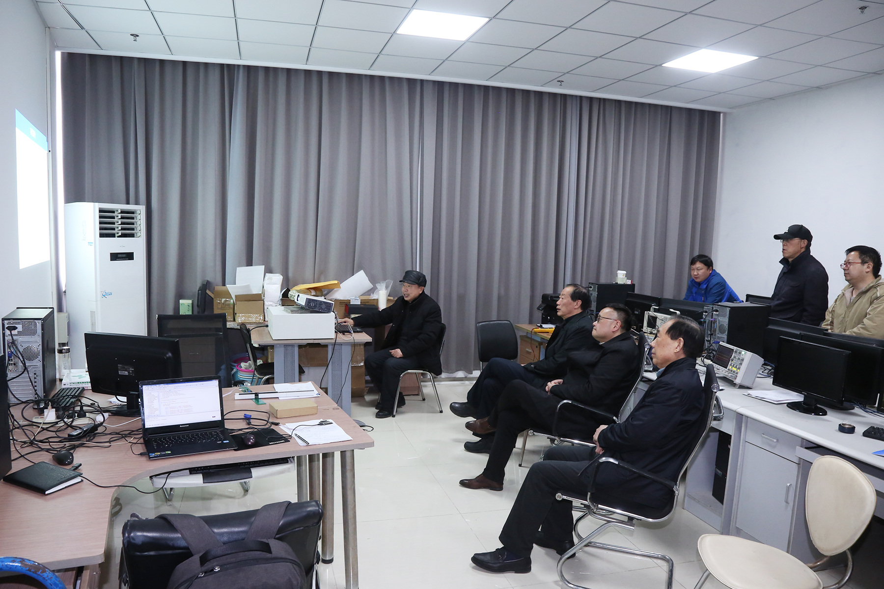 大数据与人工智能学院院长吴建国代表中心全体研究人员对领导到来表示热烈欢迎。吴建国首先简要介绍了研究中心人员组成、研究方向和目前承担课题等基本情况,其次围绕假期重点攻关项目“红外三维虚拟触控技术”,介绍了项目目前研究进展,并详细汇报了项目技术特点、应用前景、市场潜力和产业化规划等内容。
