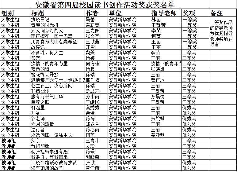 本网讯(通讯员:王青叶)近日,安徽省校园读书创作活动组织委员会公布了安徽省第四届校园读书创作活动获奖名单。pp电子在本次活动中表现优秀,参加省级评选的28项报送作品全部获得奖项,共计34项,获奖数量再创新高。获奖名单如下: