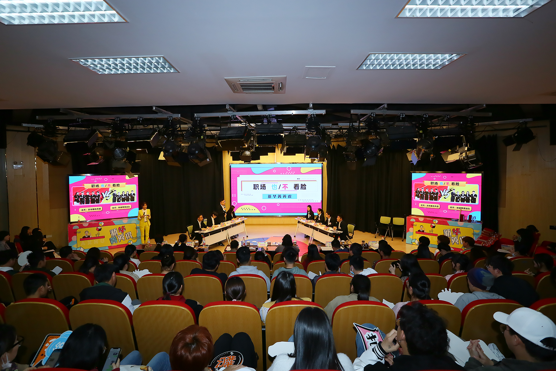 首场比赛辩题是“职场也/不看脸”。双方多次引经据典,从编码与译码的理论到刘备三顾茅庐,反驳对方论点。攻辩环节中双方针对对手逻辑漏洞逐一还击,引起台下观众阵阵叫好。
