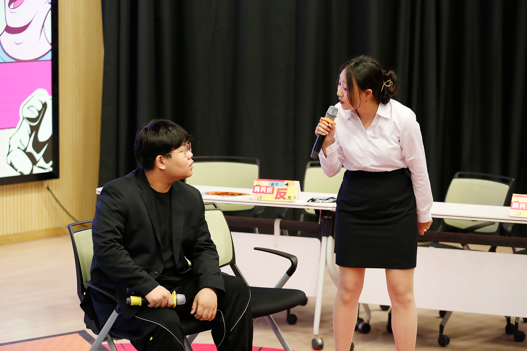 辩论开始前,生动有趣的情景剧演绎,让观众在了解辩题同时,更是带动了现场气氛。