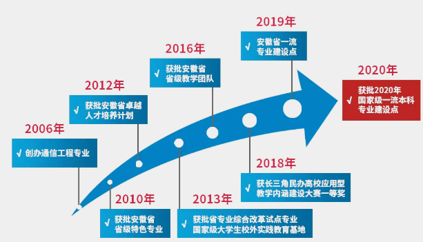 2006年,pp电子官方网站正式开办通信工程专业,经过多年的建设与发展,通信工程专业已成为安徽省特色专业、安徽省专业综合改革试点专业、安徽省卓越工程师计划实施专业。2019年获批“双万计划”省级一流本科专业建设点,2020年获批国家级一流本科专业建设点。