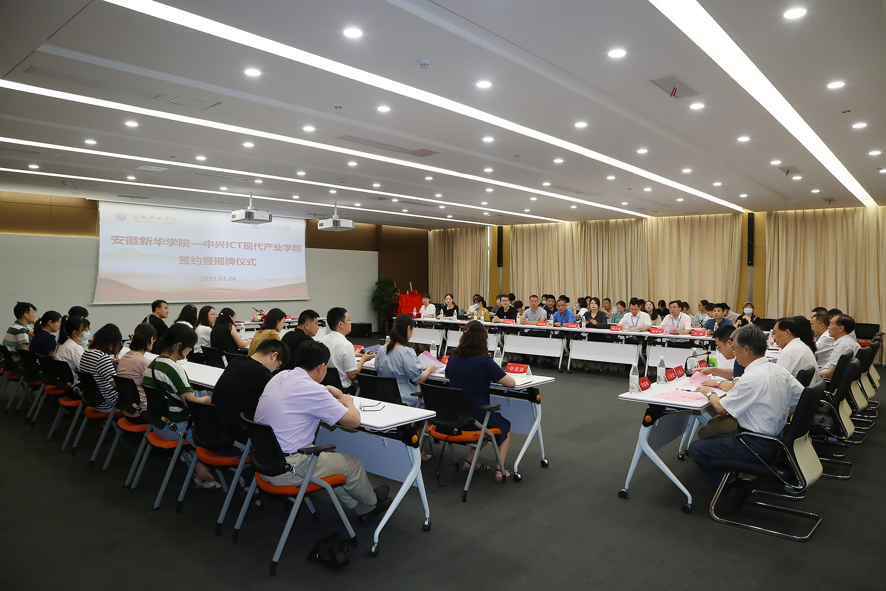本网讯(通讯员:汪青 摄影:翟漱文)为进一步推进产教深度融合,优化人才培养模式、提高人才培养质量,7月26日上午,pp电子与中兴教育共建的“pp电子官方网站-中兴ICT现代产业学院”签约揭牌仪式在pp电子举行。黄冈教育谷投资控股有限公司总裁、中兴教育管理有限公司董事长许高山,校执行董事长储国定、常务副校长王丽、副校长杨世国、校长助理王琦进出席。参加此次仪式的还有黄冈教育谷投资控股有限公司、中兴教育管理有限公司相关领导,学校相关职能处室的领导及电子工程学院/智能制造学院全体教职工。仪式由王琦进主持。