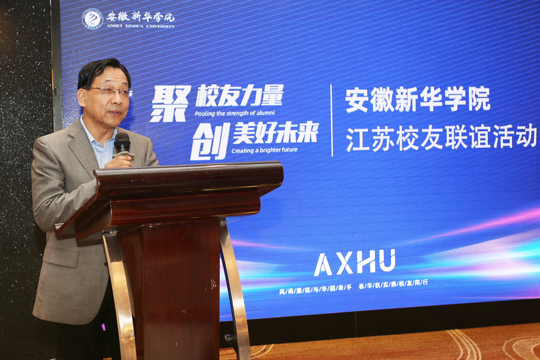 紧接着,江苏校友联谊活动的发起人、2009届土木工程专业校友徐理军致辞,他首先感谢母校对本次活动的亲切关怀与具体指导,也感谢江苏地区校友的热情参与,并表达了对母校的怀念之情。他说到,回首大学时光,仿佛历历在目,虽只有短暂几年,但广大校友都在新华园收获良多。踏入社会,新华毕业的学生以实干著称,得到社会、行业广泛认可,深感校友们取得的每一项成绩、每一份认可都与母校的培养有着千丝万缕的联系。希望借由此次活动,团结和联络江苏校友,增进校友与母校、校友与校友之间的感情,促进校友和母校的共同发展。并号召广大校友一起努力整合校友资源,凝聚校友的智慧与力量,为母校的发展和社会声誉的提升贡献力量。