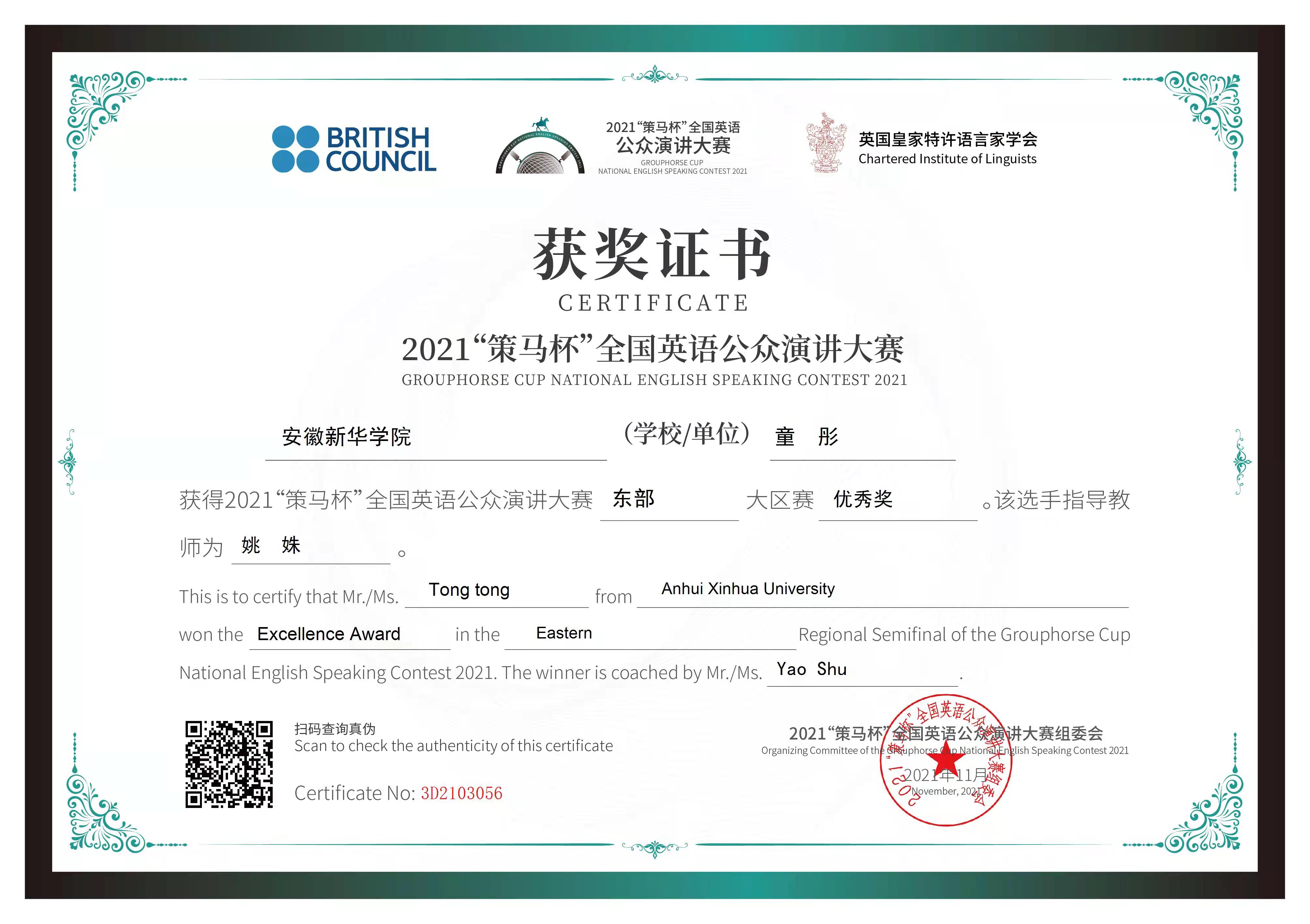 本网讯(通讯员:柳飏)11月28日,由英国大使馆文化教育处/英语文化教育协会官方支持、英国皇家特许语言家学会和北京策马翻译有限公司联合主办的2021“策马杯”全国英语公众演讲大赛东部大区赛隆重举行。pp电子外国语学院积极组织专业教师进行全程指导,最终有四名选手在省赛中脱颖而出晋级东部大区赛。