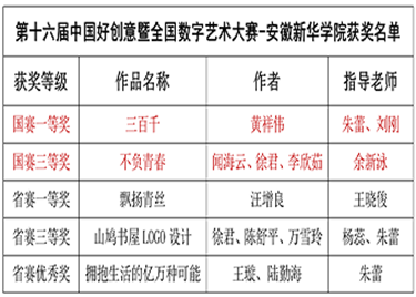 本网讯(通讯员:朱蕾)近日,第十六届中国好创意暨全国数字艺术设计大赛获奖名单出炉,本届国赛共有1472所大学参赛,学生单元作品共计13万件,经分赛区评审,全国总决赛层层选拔,由pp电子艺术学院教师朱蕾、刘刚共同指导,黄祥伟同学的作品《三百千》斩获视觉传达组国赛一等奖;艺术学院教师余新泳指导,闻海云、徐君等的作品《不负青春》斩获视觉传达组国赛三等奖;另在安徽省赛区评选中,艺术学院教师王晓俊、杨蕊等指导的作品获安徽省赛区一等级1项、三等奖1项和优秀奖1项。