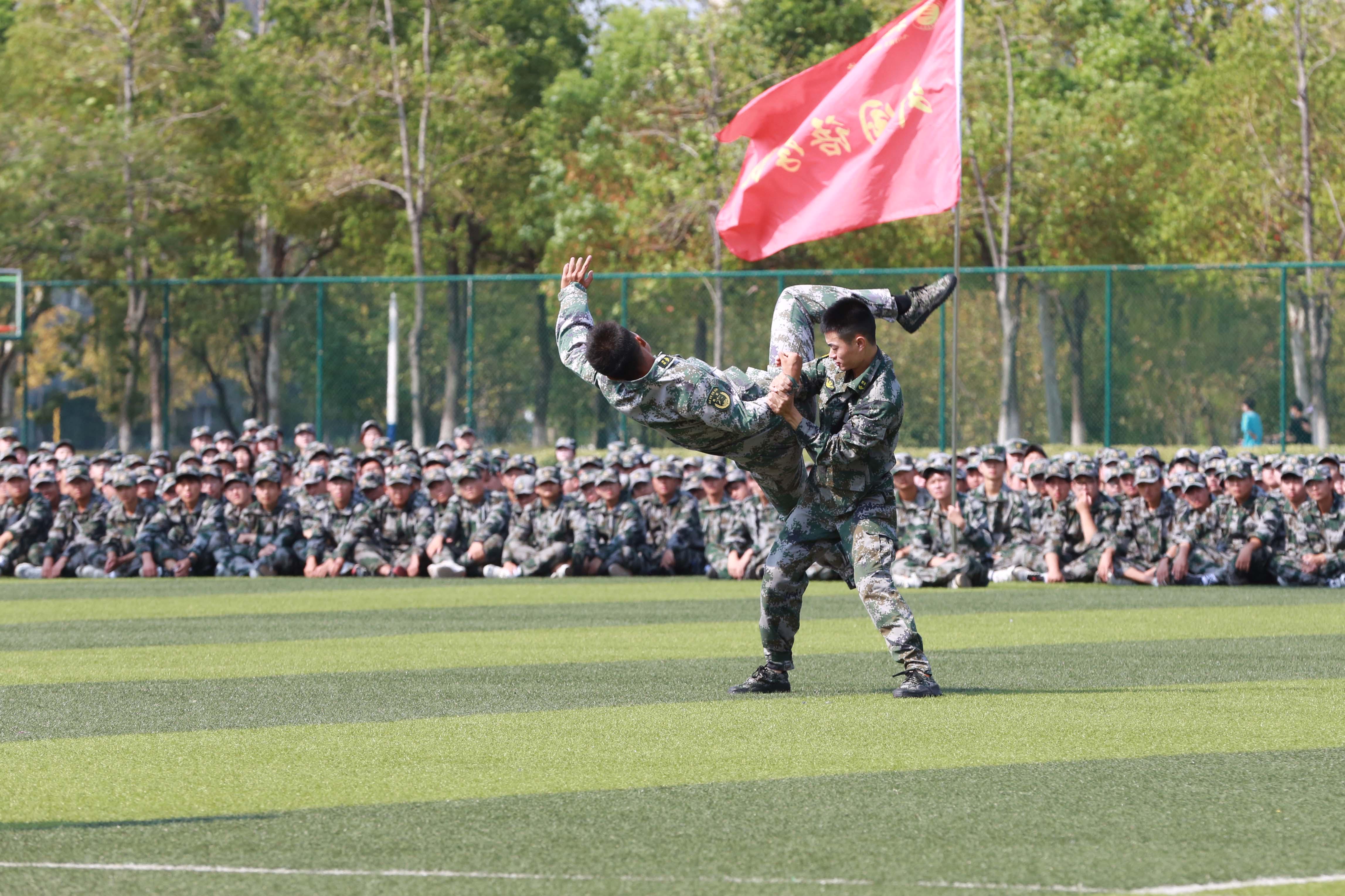 雄壮的国歌奏响,鲜艳的五星红旗在体育场迎风飘扬,军训汇报表演正式拉开帷幕。英姿飒爽的国旗护卫队健步入场,国旗方阵引领着51个新生军训方阵依次通过主席台。身穿迷彩服的新生们军姿严整、步伐铿锵、口号响亮,他们用标准的军礼、整齐的队伍、认真的态度、饱满的热情向主席台致敬,展现了新华园学子坚韧不拔、昂扬向上的精神风貌,赢得师生阵阵掌声。