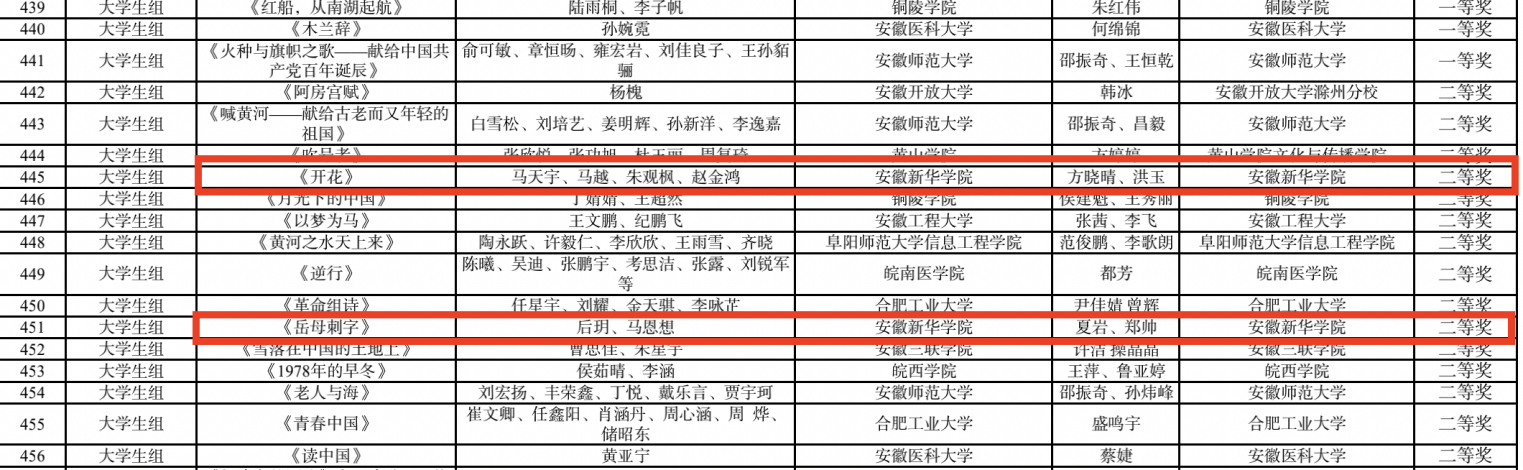 文化与传媒学院老师的作品《开花》《读中国》《闪耀吧,青春的火光》均获得教师组一等奖,这也是pp电子老师首次三组作品全部入选国赛。文化与传媒学院学生马天宇、马越、朱观枫、赵金鸿的作品《开花》(指导教师:方晓晴 洪玉 )、后玥、马恩想的作品《岳母刺字》(指导教师:夏岩 郑帅)获得大学生组二等奖;张欢欢、魏文杰的作品《青春》(指导教师:翟春翔 方晓晴)获得大学生组三等奖,其中作品《开花》入围国赛。