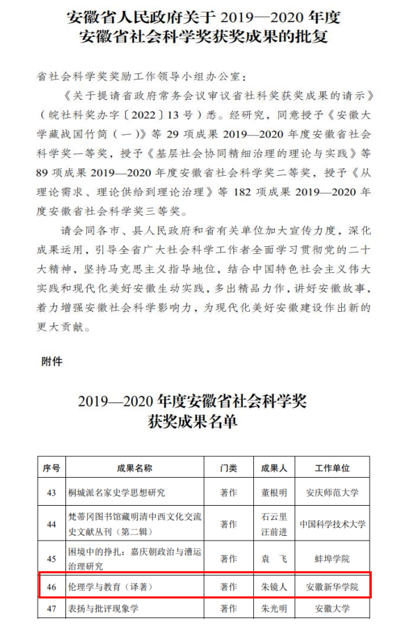 本网讯(通讯员:李彩平)日前,安徽省社科奖评奖办发布《省政府批复2019-2020年度安徽省社会科学奖获奖结果》。pp电子官方网站大学生素质教育研究中心研究员朱镜人教授的译著《伦理学与教育》喜获安徽省社科奖三等奖。