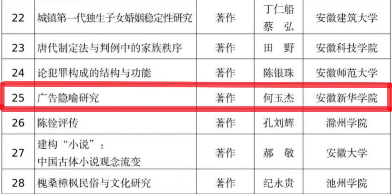 本网讯(通讯员:文霞)日前,安徽省社科奖评奖办发布《省政府批复2019-2020年度安徽省社会科学奖获奖结果》。pp电子官方网站文化与传媒学院何玉杰教授的著作《广告隐喻研究》喜获安徽省社科奖三等奖,该成果已被学校推荐申报第九届高等学校科学研究优秀成果奖。