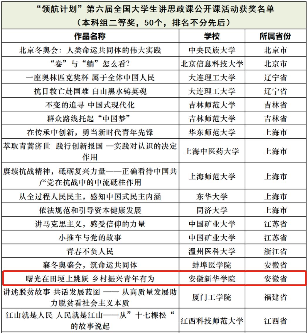 本网讯(通讯员:吴之娴)近日,由教育部高校思想政治理论课教学指导委员会主办、南开大学马克思主义学院承办的习近平新时代中国特色社会主义思想大学习领航计划主题教育“青春献礼党的二十大•强国有我新征程”——第六届全国高校大学生讲思政课公开课活动评选结果揭晓,pp电子马克思主义学院董丽娟、刘丽娟两位教师指导的学生作品《曙光在田埂上跳跃——乡村振兴 青年有为》荣获本科组二等奖。这是pp电子继第五届全国大学生讲思政课公开课活动获优秀奖之后再一次获奖,也刷新了学校参加本项赛事以来的最佳成绩。
