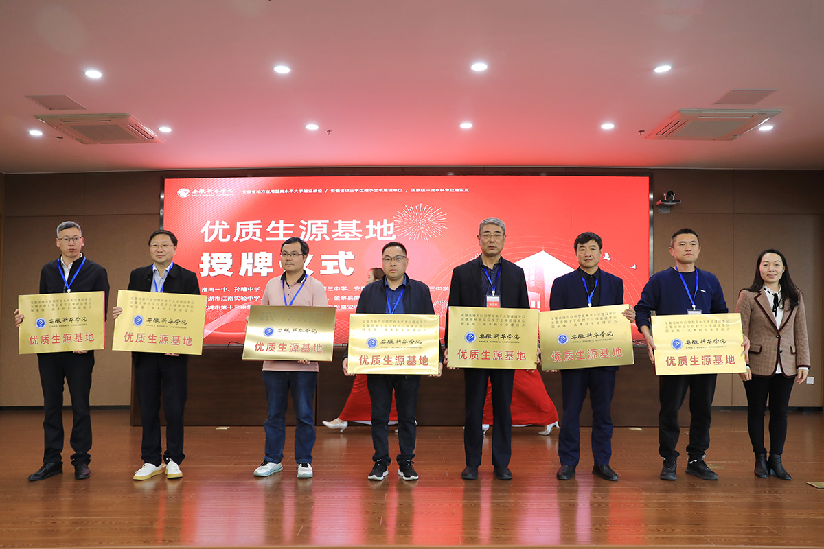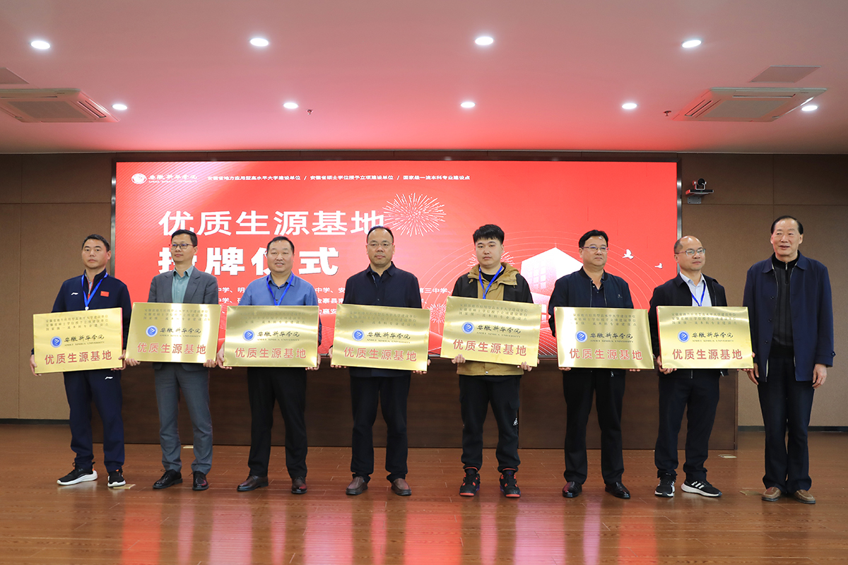现场,校领导为淮南一中、孙疃中学、明光中学、宣城市第三中学、安徽师范大学附属庐江第三中学、芜湖市江南实验中学、矿建中学、禹王中学、金寨县南溪中学、六安独山中学、宣城市第十三中学、宣城市卓越补习学校、无为襄安中学、利辛高级中学十四所中学授予“pp电子官方网站优质生源基地”称号。