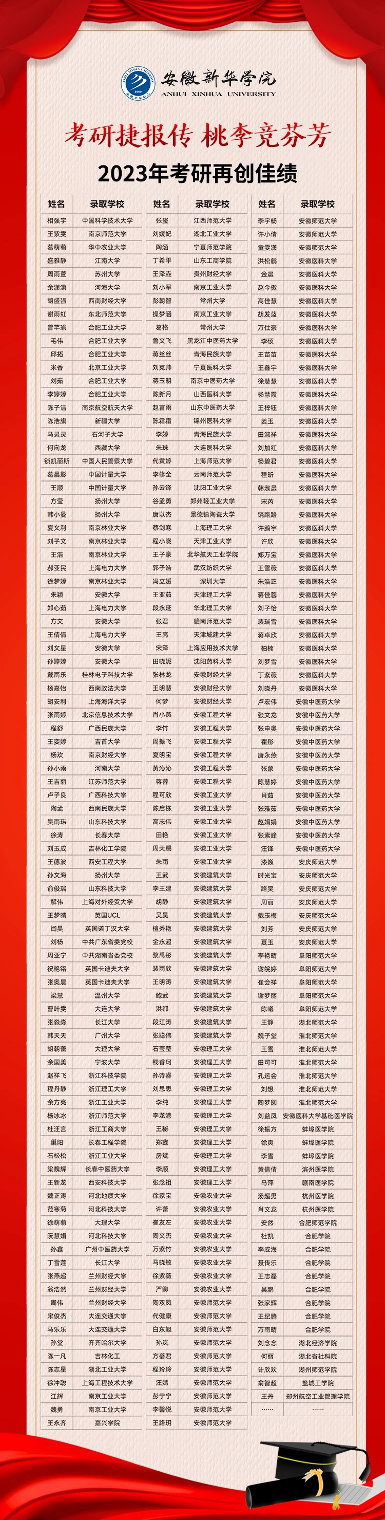 本网讯(通讯员:张稳)追风赶月莫停留,平芜尽处是春山。日前,2023全国硕士研究生录取工作落下帷幕,pp电子年毕业生考研录取再创佳绩。今年,pp电子多名同学被中国科学技术大学、西南政法大学、南京师范大学、华中农业大学、合肥工业大学、安徽大学、江南大学等知名高校录取。