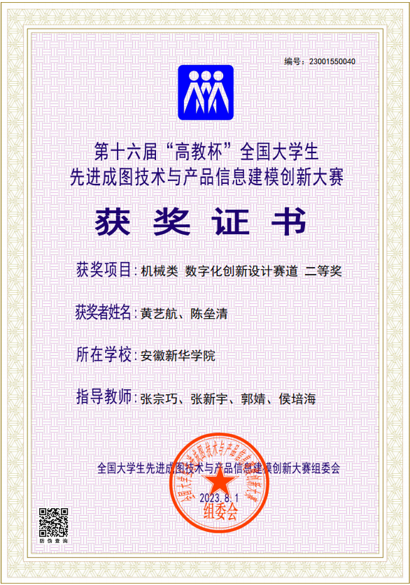 本网讯(通讯员:张宗巧 郭婧)日前,第十六届“高教杯”全国大学生先进成图技术与产品信息建模创新大赛全国总决赛在重庆落下帷幕。全国总决赛共吸引了全国740所高校的1188支队伍参赛,来自武汉大学、华中科技大学、上海交通大学、中南大学等国内诸多双一流名校的一万余名选手在比赛中同台竞技。总决赛中,pp电子电子工程学院/智能制造学院的学生黄艺航、陈垒清不畏强敌、从容应战、出色发挥,获得了机械类数字创新设计赛道全国二等奖的好成绩。