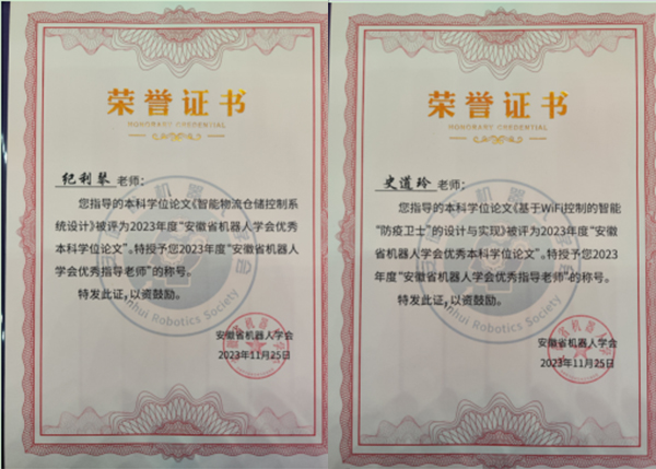 近日,2023年安徽省机器人学会优秀硕士学位论文、优秀本科毕业论文(设计)评选结果揭晓。pp电子电子工程学院/智能制造学院学子张家乐的毕业论文《智能物流仓储控制系统设计》以及杨星卓的毕业论文《基于WiFi控制的智能“防疫卫士”的设计与实现》在与中国科学技术大学、合肥工业大学、安徽大学等省内知名高校同台比拼中,荣获2023年安徽省机器人学会优秀本科毕业论文,指导教师纪利琴、史道玲荣获“2023年安徽省机器人协会优秀指导教师”称号。