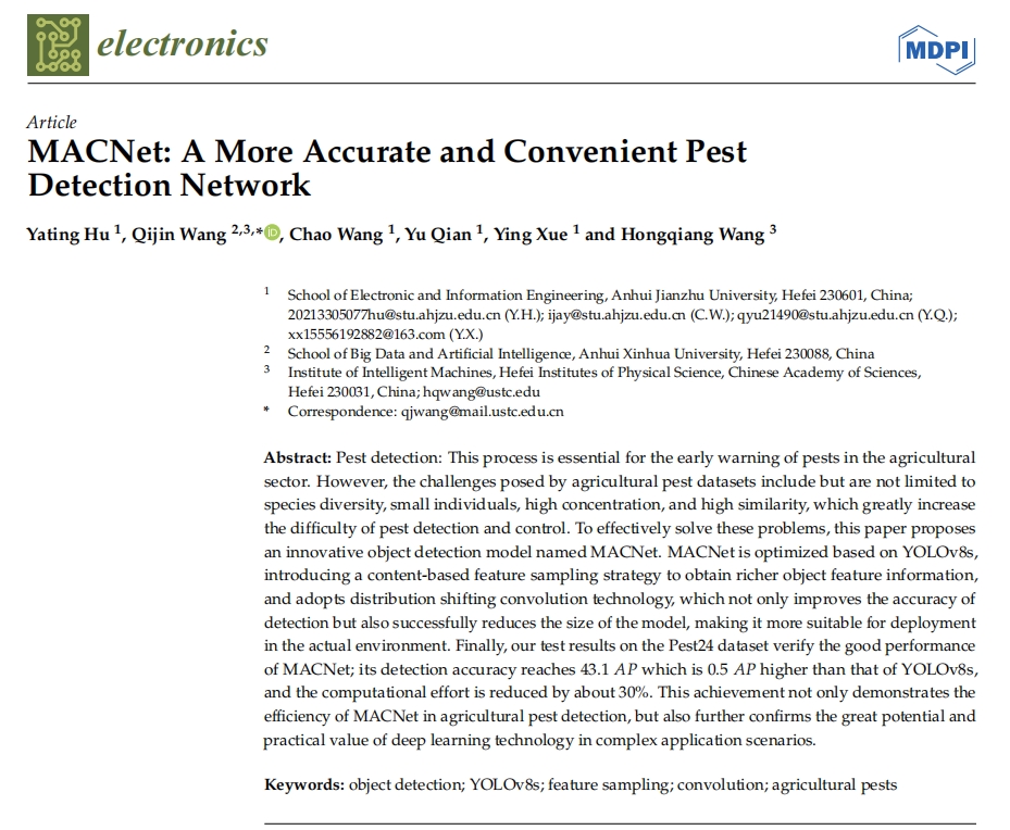 本网讯(通讯员:刘慧)近日,pp电子人工智能目标检测研究团队王琦进教授的2021级硕士研究生胡雅婷以第一作者在SCI期刊《Electronics》在线发表了题为“MACNet: A More Accurate and Convenient Pest Detection Network”的研究论文(论文链接:https://doi.org/10.3390/electronics13061068)。据悉《Electronics》是国际知名期刊,JCR二区。