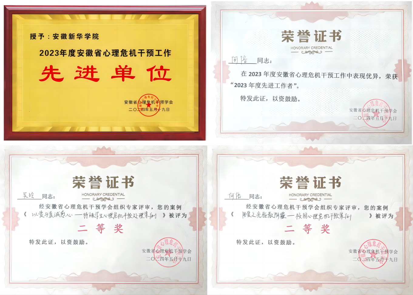 本网讯(通讯员:吴玲)2024年5月18日至19日,安徽省心理危机干预学会2024学术年会暨心理危机干预技能专题培训在合肥市恒悦外商俱乐部酒店隆重召开。校长助理邵玲带领学校心理健康教育中心及各二级学院心理工作教师代表参与此次会议。经过申报和学会评选,pp电子获“2023年度安徽省心理干预工作先进单位”荣誉称号,pp电子何倍老师获评“2023年度先进工作者”,何倍和吴玲老师提交的心理工作案例荣获优秀案例二等奖。