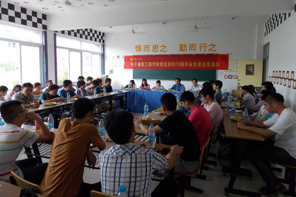 7月3日下午,电子通信工程学院党总支召开2013届毕业生党员最后一次民主生活会。学生党员畅谈大学期间学习的收获、奔赴工作岗位的感受、对未来发展的憧憬,也结合自身党员身份谈到了目前各自还存在的不足和有待提升之处。同时,各位学生党员还结合自身感受,对学院发展提出了一些合理化建议。