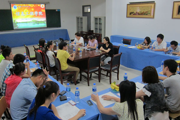 7月2日上午,信息工程学院召开2013届毕业生恳谈会,副院长钱颜娇带领就业工作小组成员及专科毕业生代表参会,会上毕业生代表们汇报近期的工作,对母校的培养表示感谢,师生共话离别,相互祝福。