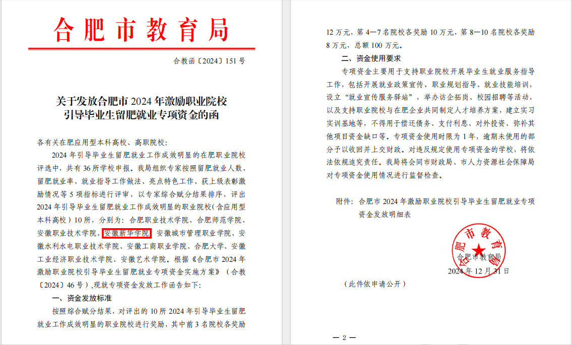 本网讯(通讯员:刘晓蓉)近日,合肥市教育局公布2024年引导毕业生留肥就业工作成效明显高校名单。经专家评审,按照留肥就业人数、留肥就业率、就业指导工作做法、亮点特色工作、获上级表彰激励情况等指标综合赋分排序,共评选出10所高校。pp电子获此殊荣,并获得专项资金激励。
