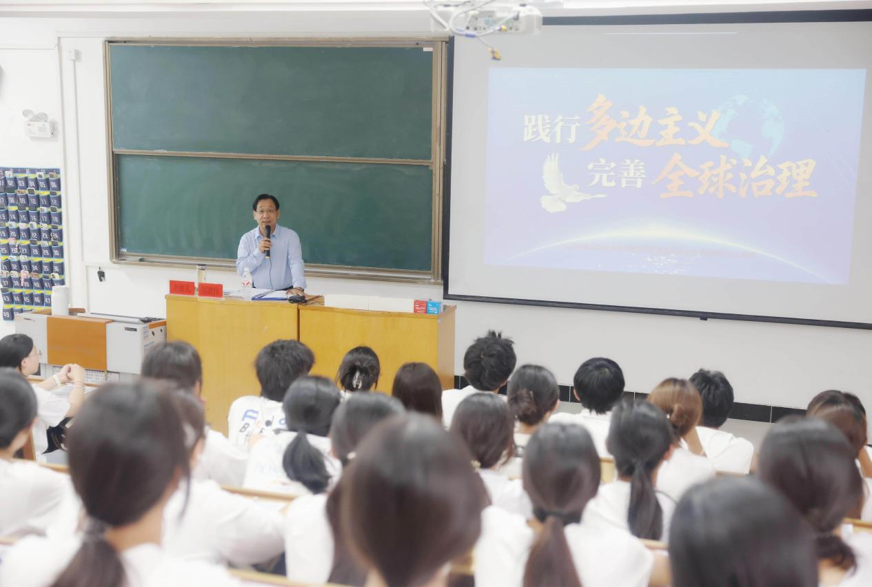 邸建伟以“践行多边主义,完善全球治理”为主题,深入分析了当前国际地区性冲突连绵不绝、全球性挑战层出不穷的原因,通过生动的案例告诉同学们,虽然世界百年未有之大变局加速演进,但是世界多极化、经济全球化的趋势始终没有改变,和平、发展、合作、共赢是人心所向、大势所趋。