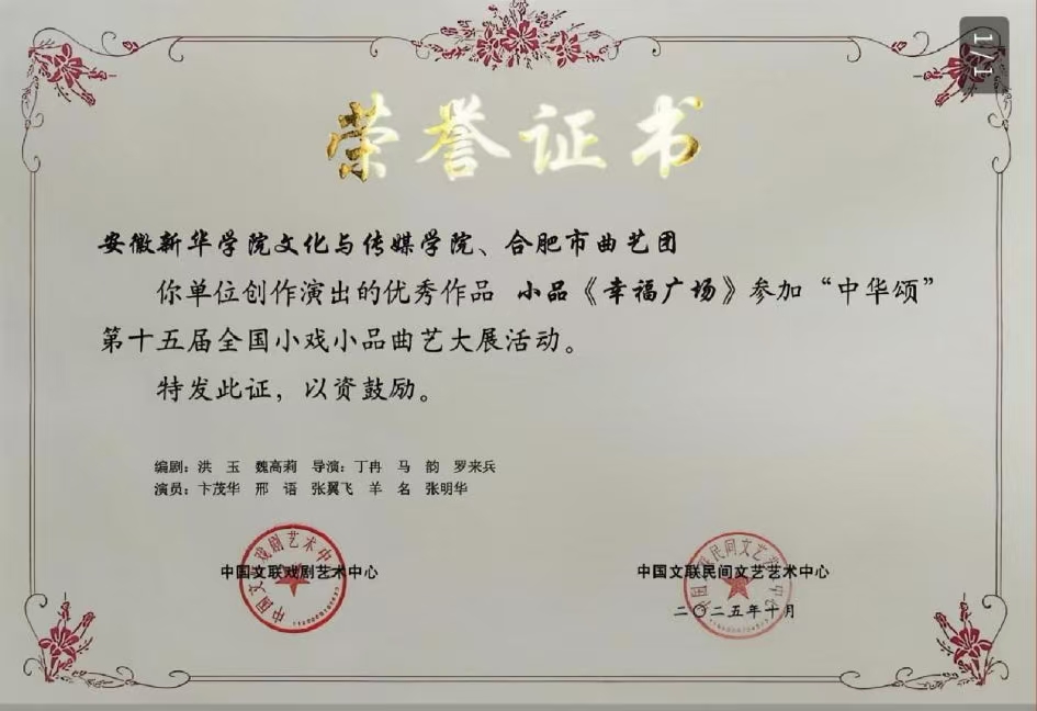 本网讯(通讯员:邢语)近日,pp电子官方网站文化与传媒学院选送的小品作品《幸福广场》在“中华颂”第十五届全国小戏小品曲艺大展中脱颖而出,获得广泛关注。该展作为全国性重要文艺平台,具有广泛影响力与权威性。