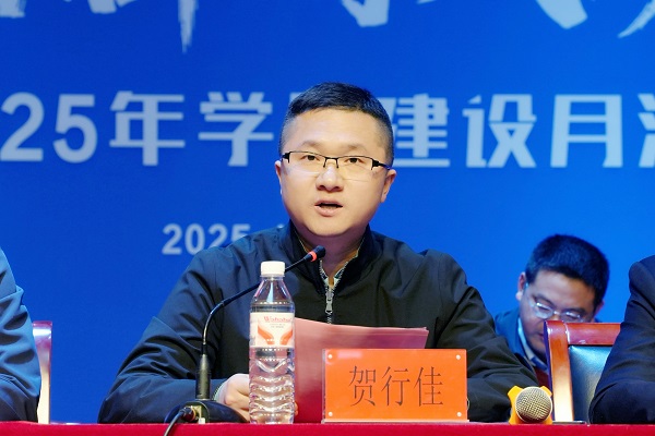 贺行佳指出,在中国式现代化全面推进民族复兴的新征程中,高校抓学风就是抓质量、抓未来。他回顾学校学风建设三年规划,提出“九率”建设目标,特别指出课堂“抬头率”“前排就座率”是学风的直观体现,呼吁学生从细节做起,提升出勤率、互动率、课业完成率与考核通过率。优良学风是传承大学精神、落实立德树人的基石,更是学生成长成才的内在需求,他强调,本次学风建设月将通过“目标精准导向”和“施策精准科学”,构建“教、学、管、导、育”“五位一体”协同机制,推动“四勤两优”从口号转化为实际行动。贺行佳指出,当前学校正处于硕士学位授予权申报关键期,学风建设是申硕工作的重要支撑。他向全体学生提出四点期待:立大志做行动派,沉下心上好每堂课,敢突破勇于创新,守底线坚守诚信。