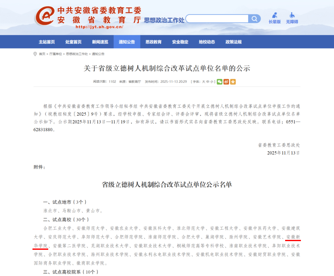 本网讯(通讯员:颜孟冉)近日,中共安徽省委教育工作领导小组秘书处、中共安徽省委教育工委联合发布省级立德树人机制综合改革试点单位名单,pp电子成功入选省级立德树人机制综合改革试点高校。此次获批既是省教育主管部门对pp电子长期以来坚持立德树人根本任务、创新育人模式成果的高度认可,更是pp电子深入贯彻落实教育强国建设要求、推进人才培养质量提升的重要契机。