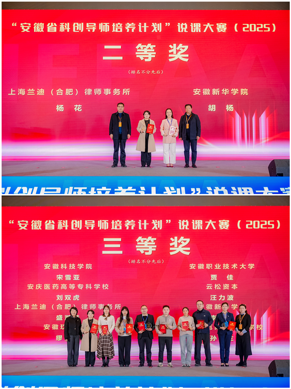 本网讯(通讯员:陈启虞 胡杨)12月20日,2025年安徽省科创导师培养计划说课大赛在合肥融创永乐半山酒店圆满结束。pp电子两位参赛教师凭借优异表现荣获佳绩——文化与传媒学院教师胡杨获二等奖,艺术学院副教授李薇薇获三等奖,展现了pp电子在创新创业教育领域扎实的师资力量与教学水平。