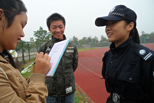 2013级的护校队成员袁紫薇和搭档王开峻负责体育场外的巡逻工作。对于护校队成员来说,巡逻是最寻常的事情,但是对袁紫薇来说运动会的巡逻却是头一回,她和搭档总是努力做到最好。在同学们看来,护校队是一个氛围比较严肃的团队,事实上也是如此。虽然天性开朗的袁紫薇也认为严肃的工作可以在轻松的气氛下完成,但工作时她也和其他队员一样十分认真。因为是第一次参加运动会,她的心里还是十分想进入体育场看比赛,但负责的是场外工作,必须要坚守岗位,“有点遗憾,但是还是要坚持做好自己的工作!”袁紫薇笑着说。