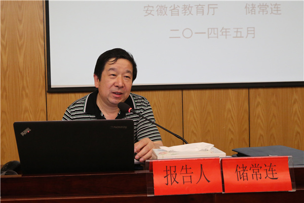 储常连回顾了我省改革开放以来高等教育的发展历程,结合我国目前高等教育存在的四大矛盾和我省高等教育的情况,从“怎么看、怎么干、怎么想”三个方面深入阐述了如何加快构建具有安徽特色的应用型高等教育体系。他认为,建设地方特色高水平大学是地方大学改革发展的必然选择,需要积极探索和大胆创新,是大学的共同的责任。储常连指出,目前我省处于建设高教强省的关键期、处于追赶高教强省的加速期、处于推进改革的攻坚期和持续发展的转型期,高校要转变思想,统一认识,确立“科学定位、分类指导、多元发展、特色办学”的发展思路,构建“服务地方、支撑经济、引领发展”的应用型高等教育体系。储常连重点从“六个转变”的角度提出如何转型提升,提高高等教育对美好安徽建设的服务支撑能力,即:转变发展方式、转变高等教育结构、转变人才培养体制、转变教育教学行为、转变教育评价机制、转变教育思想观念。储常连还从提高“五个度”的角度提出科学构建应用型高校质量保障体系,即:提高办学定位与社会需求的符合度;提高高校四大职能对办学定位的支撑度;提高人才培养各环节之间的吻合度;提高教育教学资源对人才培养的保障度;提高学生、社会、用人单位、政府对教学质量的满意度。储常连强调,高校要开放合作,深入推进专业改革。引入职业资格准入制度,改革专业人才培养模式;引入行业标准,制定专业建设和专业评估认证标准;引入企业核心技术标准,研究制定专业核心课程标准;引入行业专家,建立专业教学队伍;引入行业(企业)的积极参与,建立校企合作的长效机制。