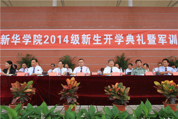 教官代表周洋洋在讲话中阐述了开展大学生军事训练工作的重要意义,并表示在接下来的军训中做到科学训练,精心安排,严密组织,耐心指导,高度重视,全心投入,让同学们以崭新的精神面貌去迎接下一阶段的学习和生活。来自商学院2012级的韩金城同学作为老生代表上台发言,他表达了对新华的热爱和身为新华学子的自豪。大学是学习知识的天堂,军训让每一位新生变得勇敢、变得坚强,他用“大浪淘沙,方显真金本色;暴雨冲过,更见青松巍峨!”来鼓励新生们一起书写新华更加辉煌的明天。军训团七营一连管幸源同学作为新生代表表达了自己对大学生活的渴望,他将与新生们一起在新华学文化,学做人,敢打敢拼,敢闯敢荡,用自己的双手,打开收获之门。文化与新闻传播学院吴海红作为老师代表发言,她建议同学们进入大学,第一要紧的事是要恢复求知欲,让同学们知道问题永远比答案重要。她还要求同学们要大量地阅读、思考以及交流和实践,激励同学们在失败中摸索、成长。