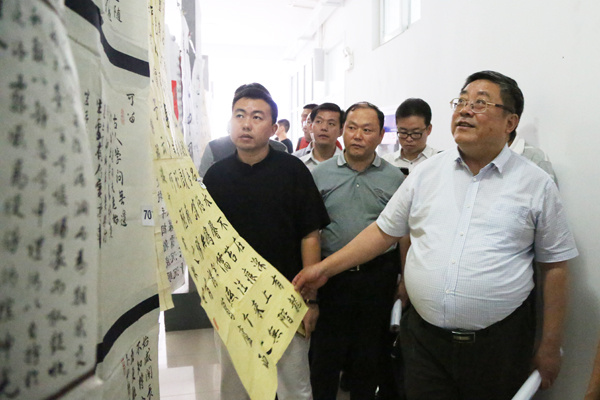 本网讯(学生记者 宁薛敏、张志彦)9月5日,全省大中小学师生书法作品征集评选活动终评会在pp电子官方网站举行。省教育厅总督学李明阳,省文联副主席、书记处书记、省书法家协会副主席吴雪,新华集团副总裁、学校执行董事王孝武,学校党委书记、督导专员胡昭林等出席活动。