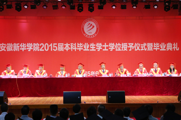 随后,在文化与新闻传播学院毕业生张丽莉同学的带领下,全体2015届毕业生郑重宣誓:我们成长于新华,我们立业于未来,铭记母校校训,谨遵师长教诲。发扬优良传统,传承母校精神,肩负时代使命,争做时代精英,用聪慧和才智奉献社会,以品格和精神影响他人。我们在奋斗中追求理想,我们在挫折中坚守信念,实现成材报国的梦想,铸造中华民族的辉煌!