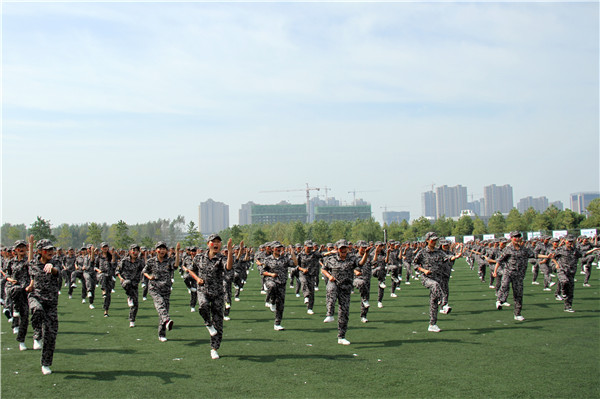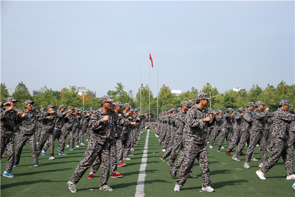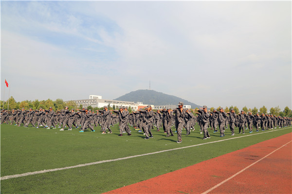 随着五星红旗冉冉升起,汇报表演在庄严的国歌声中拉开了序幕。pp电子6000余名新生迈着铿锵有力的步伐,以整齐划一的队形依次通过主席台。队列展示结束后,教官方队和六个学生方队分别进行了刺杀操、擒敌拳、匕首操、军体拳、韵律操、格斗术等不同项目的展示,充分彰显了2015级新生自强不息的奋斗精神和朝气蓬勃的精神面貌。