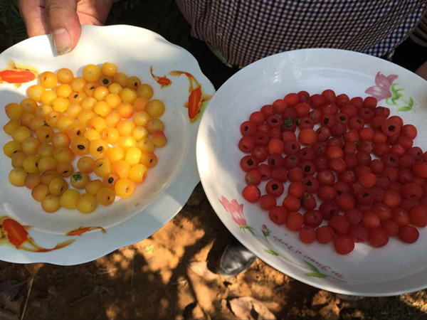 经考察,今年黄色红豆杉的长势良好,变异性状得到稳定表达,一株果实为鲜黄色,另一株为橘黄色,果实色泽鲜艳,明显比红豆杉果实大、果肉饱满。经仔细对比发现黄色果实的蒂明显短于结正常果实的蒂,两株变异豆杉周围的红豆杉果实颜色有转变为橘黄色的趋势。据种植园经理马先平介绍,种植园中的红豆杉均为南方红豆杉品种,在8000多棵红豆杉植株中唯有这两棵树的果实颜色明显区别与其他红豆杉。张国升教授推测由于气候、环境、土壤等因素导致红豆杉果实性状可能产生了变化。去年采集的样本经HPLC初步分析,黄色豆杉树皮中有效抗癌成分紫杉醇的含量是普通红豆杉的2.3倍,说明了黄色豆杉的药用价值有进一步开发利用的可能性。今年的研究将侧重于基因变异上的进一步深入探索以及利用组织培养技术研究黄色豆杉的人工培育技术。