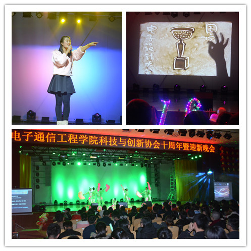 晚会随着“逐梦十年,共创未来”主题幻灯片的放映拉开帷幕,幻灯片回顾了科技与创新协会的十年历程。卢胜代表电子通信工程学院致辞,他总结了科技与创新协会过去十年取得的成绩,尤其是在组织大学生“飞思卡尔”杯智能车大赛、电子设计大赛中发挥了较大的作用。卢胜表示,电子通信工程学院广大师生正以崭新的面貌和饱满的热情,不断进取,积极开拓。科技与创新协会第一届学生代表张军在发言中表达了对母校和老师的感恩。