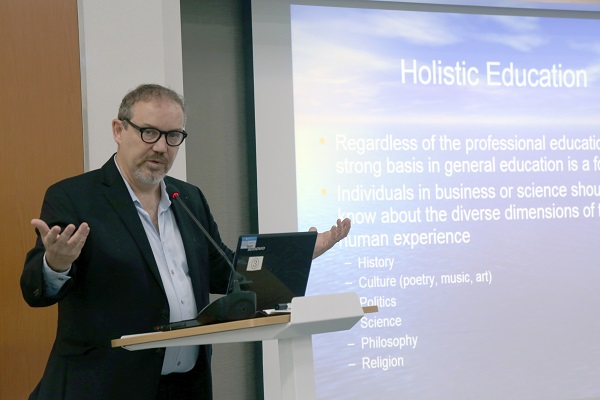 Darrell Arnold教授以“全球化背景下的民办教育和人文教育与技术”为题,介绍美国民办大学的人文教育情况,以及美国素质教育中的哲学理念与中国儒家思想和中国哲学的相似之处。他提出将古希腊的哲学运用到高等教育中,要注重创造性思维、语言表达和沟通能力培养,强调个人的成功离不开语言技能和文化理解,并表示,科技的发展促进了全球贸易和全球通信的发展,也促进了语言教学、大学项目交流、海外留学产业的发展。