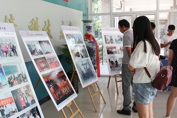 文化与新闻传播学院内摆上了暑期“三下乡”、话剧节、诗歌朗诵大赛等诸多特色活动照片以及优秀学子风采展示,吸引众多新生和家长驻足观看,浓厚的文化气息扑面而来。
