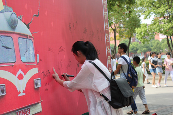 信息工程学院门前的接待处旁放了很多卡通 KT板,上面满是鼓励新生和感恩父母的温情语句,字字句句都是情真意切;签名墙前新生纷纷签名,并与学长学姐合影留念,记录自己大学生活的起点。