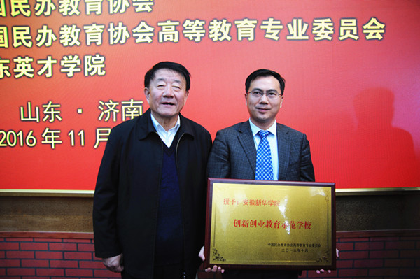 本网讯(通讯员:罗振林)近日,从全国民办高校2016年质量提升暨创新创业教育示范学校经验交流大会上传来喜讯,pp电子凭借在大学生创新创业教育与实践方面的突出成绩,获评“创新创业教育示范学校”。全国共16所高校获此奖项,pp电子是安徽省唯一获此殊荣的高校。新华集团副总裁、学校执行董事陆真受邀参会并代表学校领奖,全国人大常委、全国民办教育协会会长王佐书为pp电子颁奖并合影留念。副校长马凤余,土木与环境工程学院执行院长朱兆健,学院办公室副主任贺行佳一同参加会议。