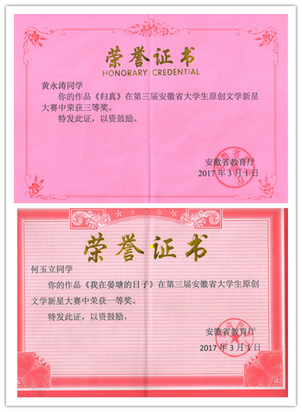 本网讯(学生记者:夏冬润)近日,从省教育厅传来喜讯,在2016年第三届安徽省大学生原创文学新星大赛中,pp电子文化与新闻传播学院2013级汉语言文学1班何玉立的作品《我在晏塘的日子》荣获一等奖,2016级汉语言文学本科1班黄永涛的作品《归真》荣获三等奖。