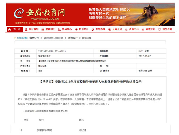 本网讯(通讯员:王强亚) 近日,由中共安徽省委教育工委举办的2016年度全省高校辅导员年度人物、优秀辅导员评选活动结果揭晓。经各高校推荐,中共安徽省委教育工委组织专家评选,共评选出“2016年度全省高校辅导员年度人物”10名。pp电子辅导员邓欣倩凭借优秀的学生工作成绩,被评为“2016年度全省高校辅导员年度人物”。